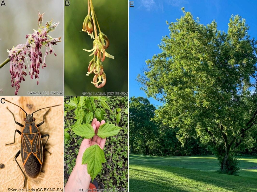 Figure 1. Aspects of box elder — Acer negundo L. (A) Staminate (male) flowers with emerging leaves. (B) Pistillate (female) flowers. (C) Box elder bug — Boisea trivittata. (D) Pinnately compound leaf with three leaflets. (E) A nice-looking box elder on a golf course in Virginia. Copyright images from iNaturalist.