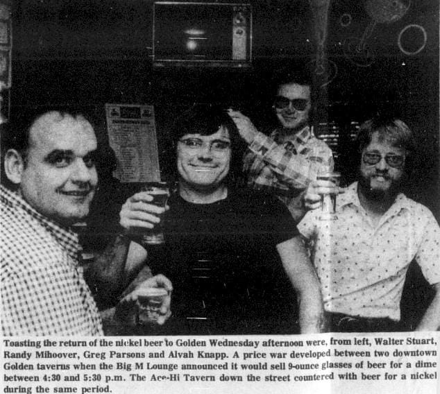 The August 13, 1975 Golden Transcript described a price war that raging between two downtown bars. The battle was joined only once each week, during Wednesday happy hour. The Big M Lounge (where Woody’s now is) had a new manager, and he posted a sign promising a 9 ounce glass of Coors draft for only 10 cents.