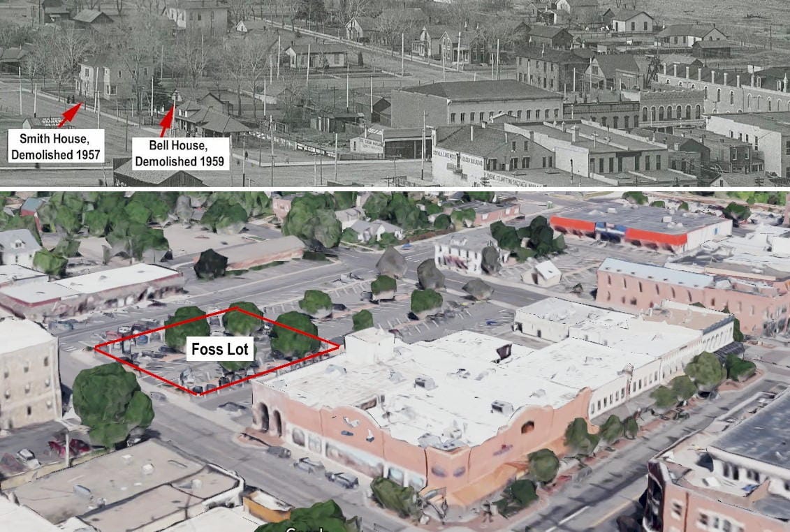 Denver Public Library Western History Collection # Z-12056In 1957, the City doubled the price of business licenses and raised the mill levy to finance purchase of downtown property to be used as parking lots. Not content to wait for public parking, Heinie Foss purchased a large home and yard behind his store to be turned into a parking lot. In 1959, Mr. Foss bought the other home behind his store–the home that had belonged to Gertrude Bell (of Bell Middle School fame). Both houses were demolished and the land made available for Foss customers.