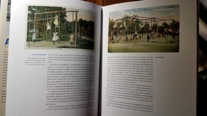 This inspired Ms. Biondo to travel around, searching out old playgrounds with old equipment, which she began to photograph. That sounded like exactly the kind of project I would undertake, and I was so intrigued that I bought the book. I learned that playgrounds were developed as part of the Progressive movement in the early 20th century. They were a new idea, designed to keep kids busy, healthy, and out of trouble. They soon began to appear in towns across the country.