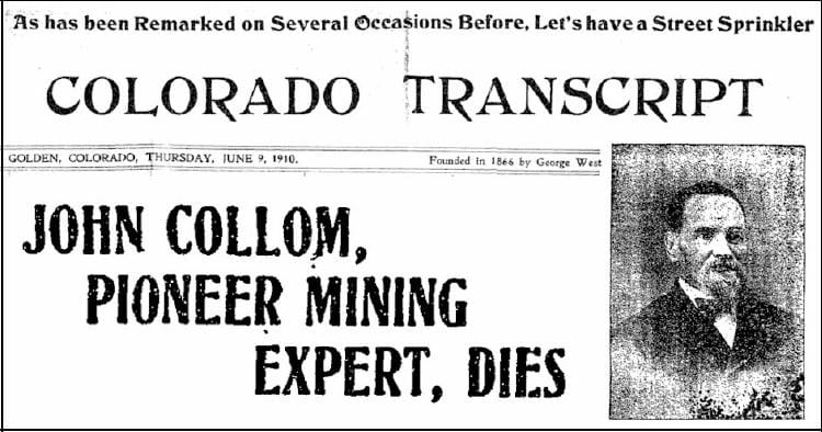 John Collom died 115 years ago this week. He was born in England in 1833 and became a mining expert. His employers sent him to Colorado in 1865 to investigate mining opportunities, and he remained here for the rest of his life. Collom established several concentrating works and smelters in this part of the state, including the Malachite Smelter here in Golden.