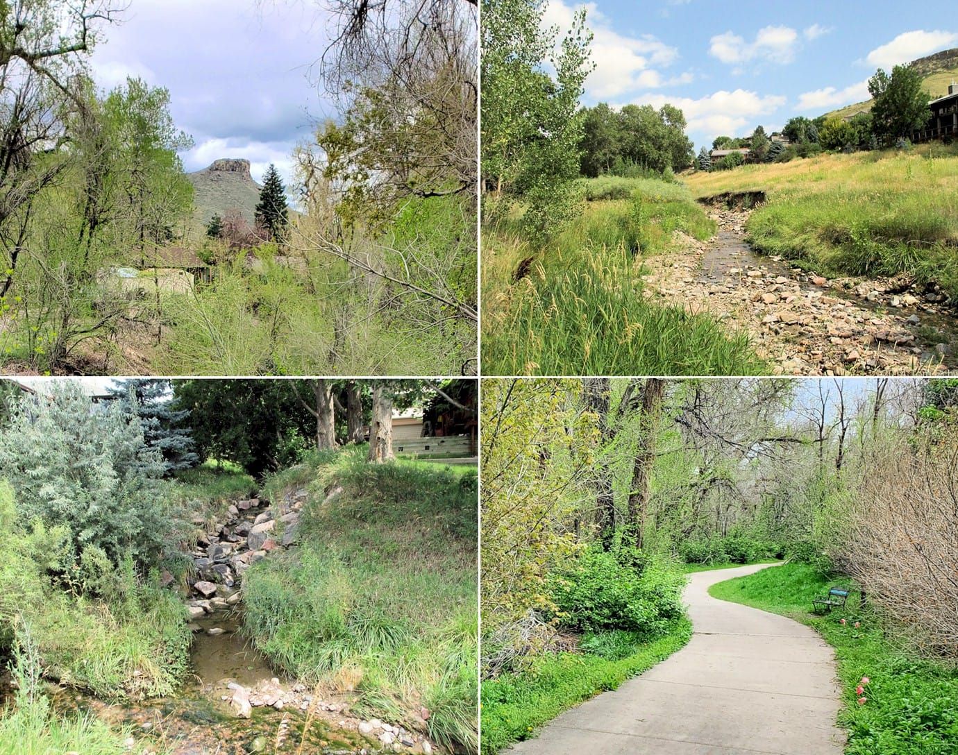 Top Left: Castle Rock seen from Tucker Gulch. Top Right: Tucker Gulch just above 1st street. Bottom Left: Cressman Gulch enters Tucker Gulch. Bottom Right: Tucker Gulch Trail below 1st Street. - Click to enlarge