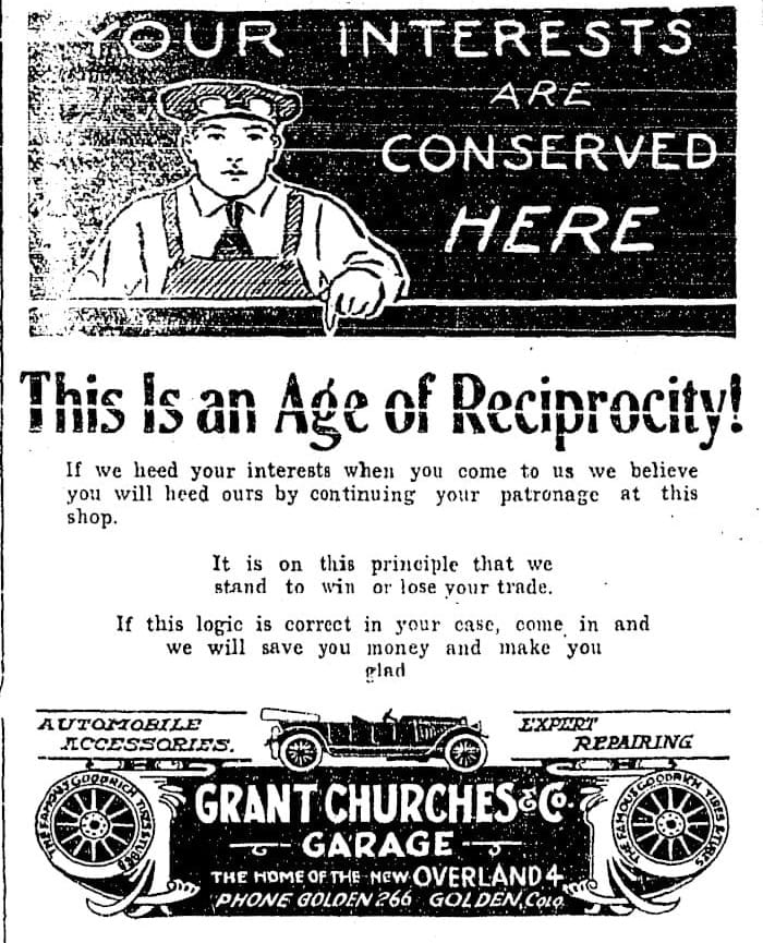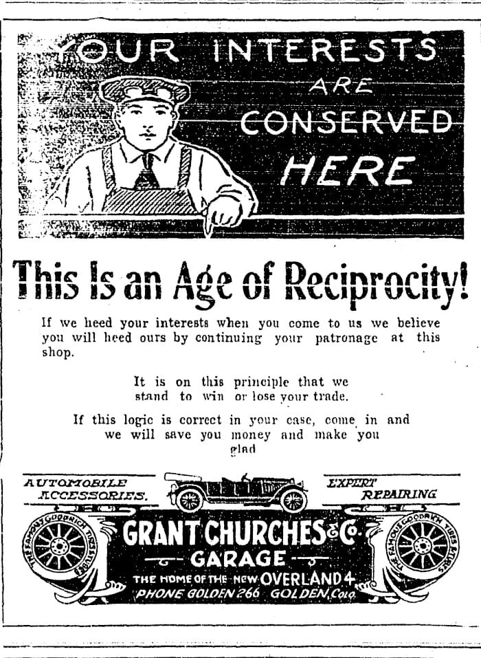 This advertisement for Grant Churches' Garage appeared in the November 4, 1920 Colorado Transcript. The garage must have done well, because in 1922 Mr. Churches moved from his location on 12th Street, building a new, bigger facility on Washington Avenue.