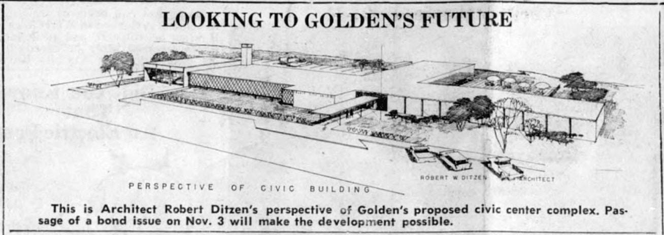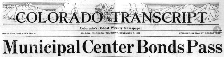 The City of Golden celebrated its 100th anniversary in 1959. The City was experiencing the post-World War II rush to suburbia and growing at a tremendous clip. City offices were located behind the fire station on 12th Street. In the spring of that year, the Chamber of Commerce and City Council members decided that the best way to celebrate the centennial would be construction of a new municipal center. It would include a new fire station, police station, library, museum, offices for City employees, a recreation center, and a swimming pool.