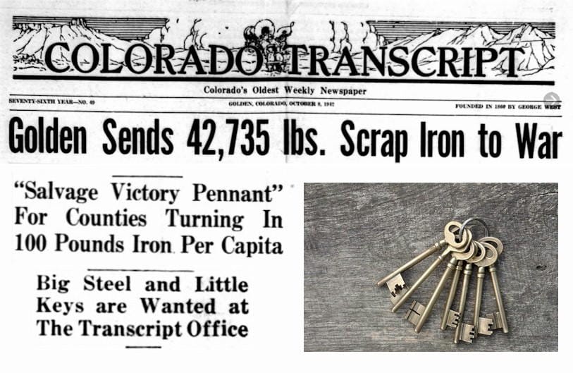 The Transcript put their own spin on the drive. They were collecting stray locks and keys. Apparently many Goldenites had a collection of mystery keys. “Dave Johnston brought in a box full of old locks and keys, no two of which fit; and we have the large key ring, big enough to hang a man, that Fred Robinson turned in full of keys of all sizes, last week.”