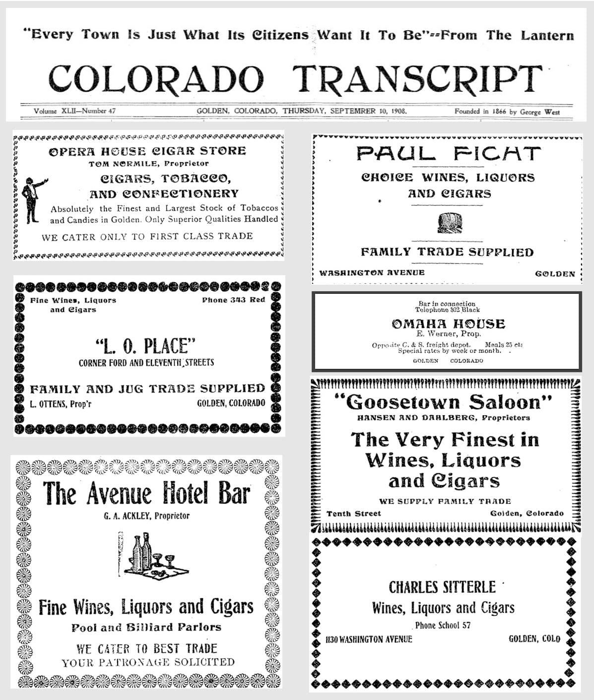 The September 10, 1908 Colorado Transcript shows a lively saloon scene, with many of our local businesses advertising their "Fine Wines, Liquors, and Cigars," "Choice Wines, Liquors and Cigars," and "Finest and Largest Stock of Tobaccos and Candies."