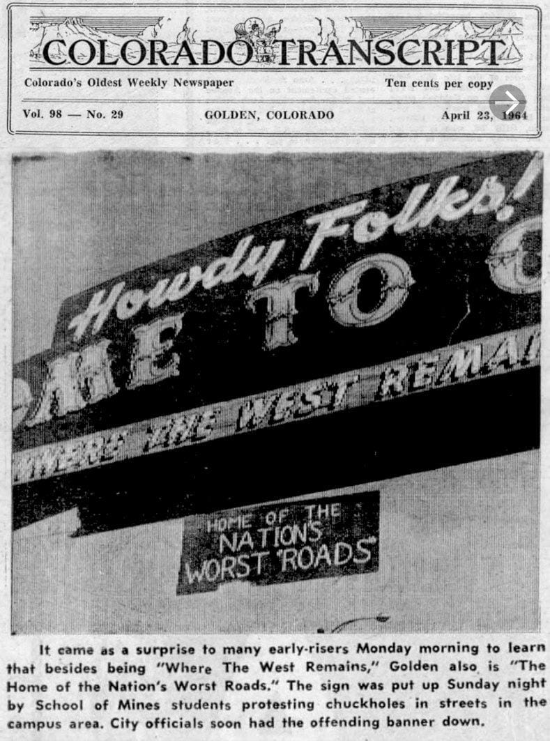 The article explained that the students—unhappy with the state of Golden’s streets—had posted a banner under the Welcome arch saying “Home of the Nation’s Worst Roads.” The Transcript interviewed one of the students, who claimed that Golden’s streets were full of chuckholes [potholes], some of them nine inches deep. He said that his car was a junker, but many of the students had good cars, including sports cars, and some had suffered wheel damage from Golden potholes.