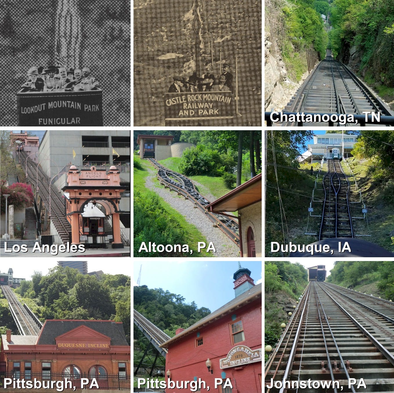 There are still a few funiculars left in the U.S. Of those, the ones in Los Angeles, Dubuque, Chattanooga, and Altoona are set up with passing lanes. The Pittsburgh railways were designed so the “going up” car and the “going down” car–each has its own pair of rails–no passing area required.