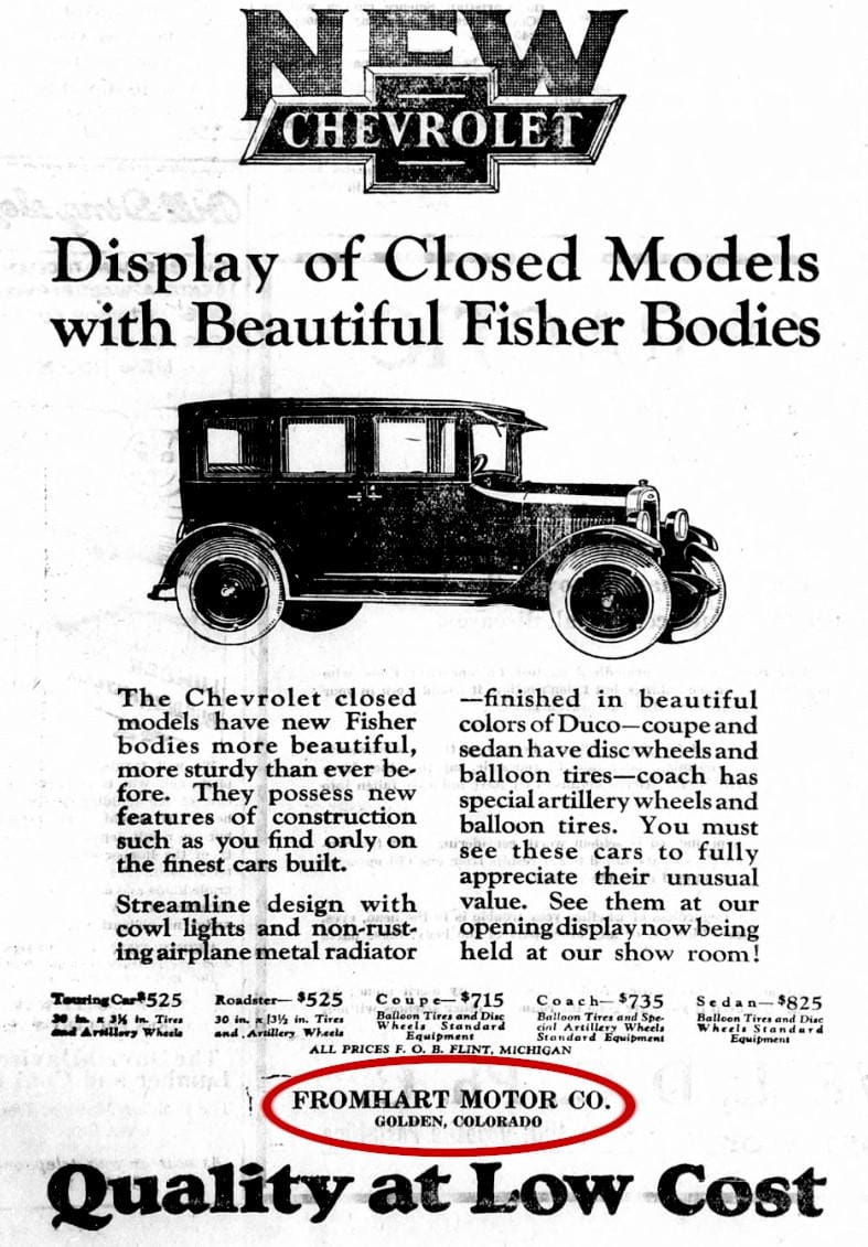 Mr. Fromhart was an early-day blacksmith, and did much wagon building and horse-shoeing for the Adolph Coors Co. Later he was in the hardware business and eventually entered the automobile business. He was a dealer for Chevrolet cars, and others, for many years.