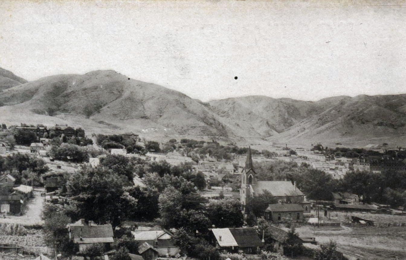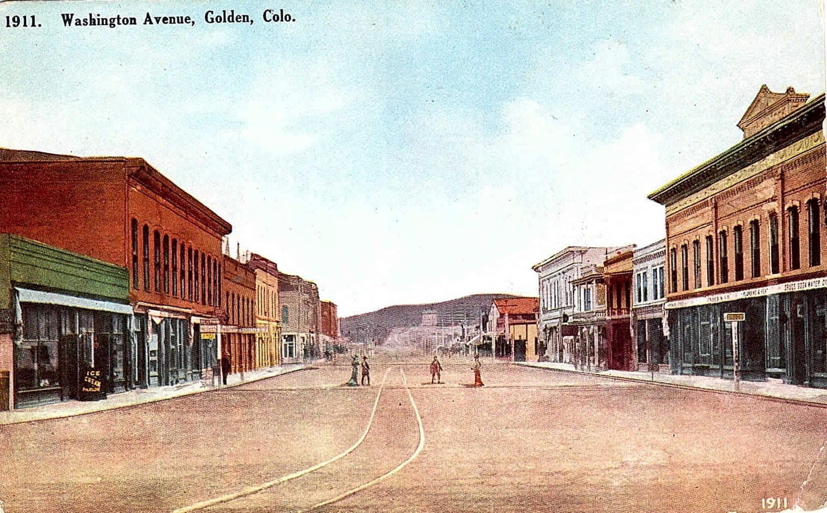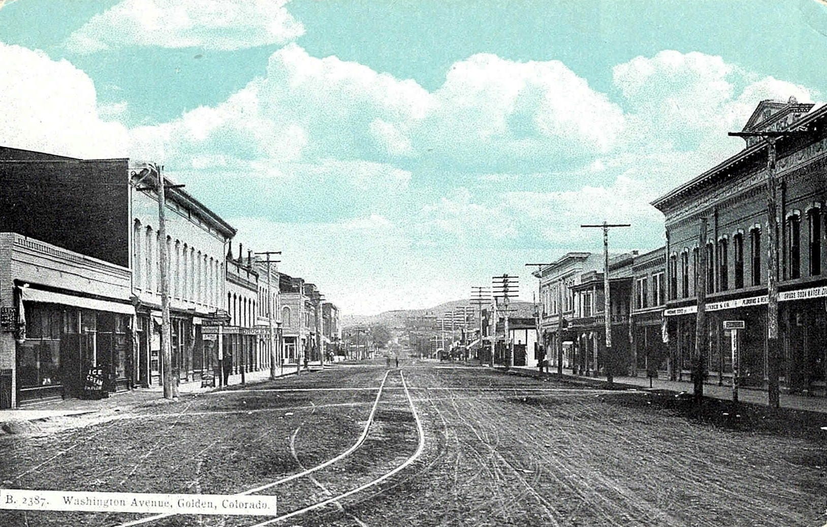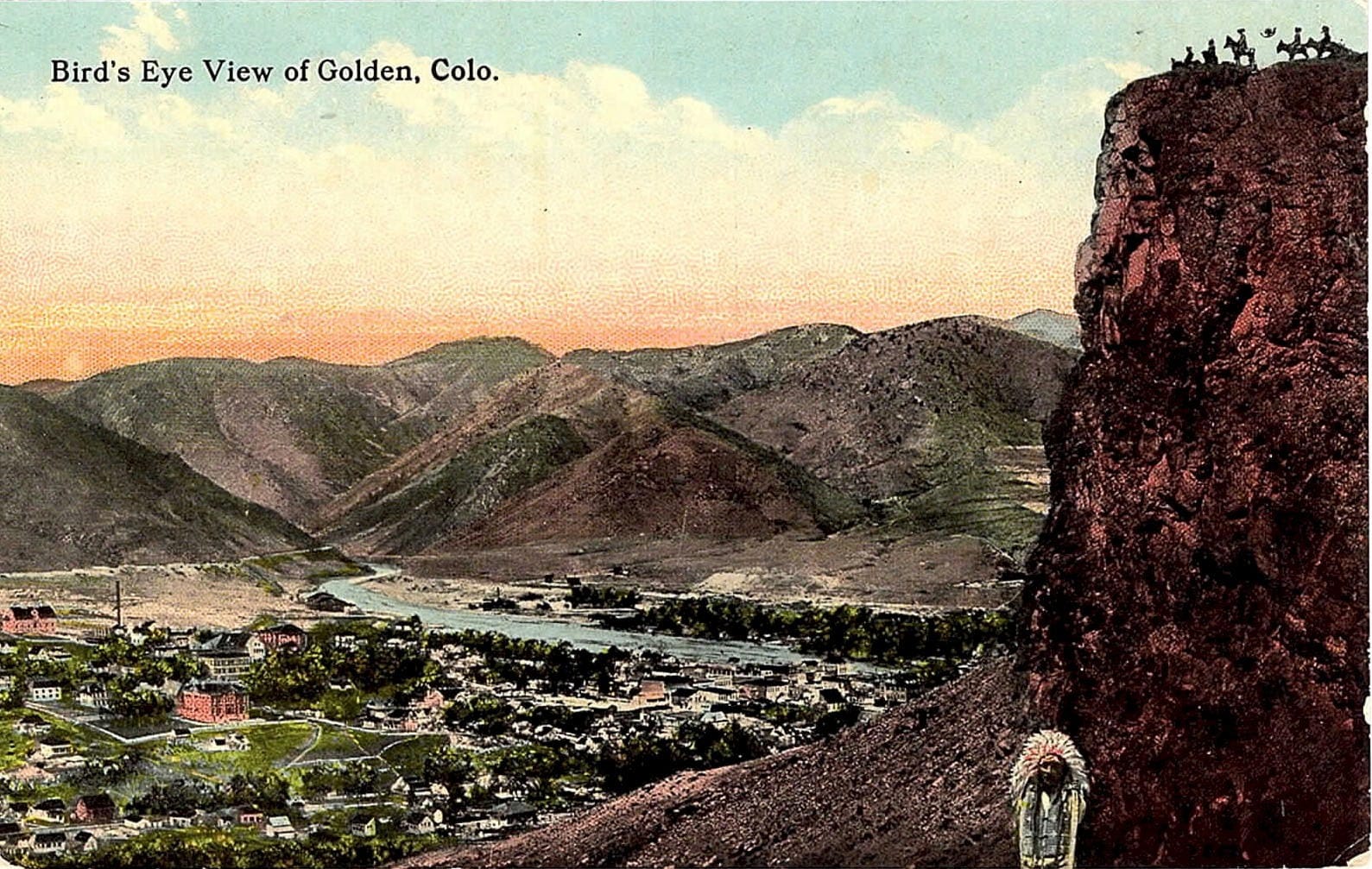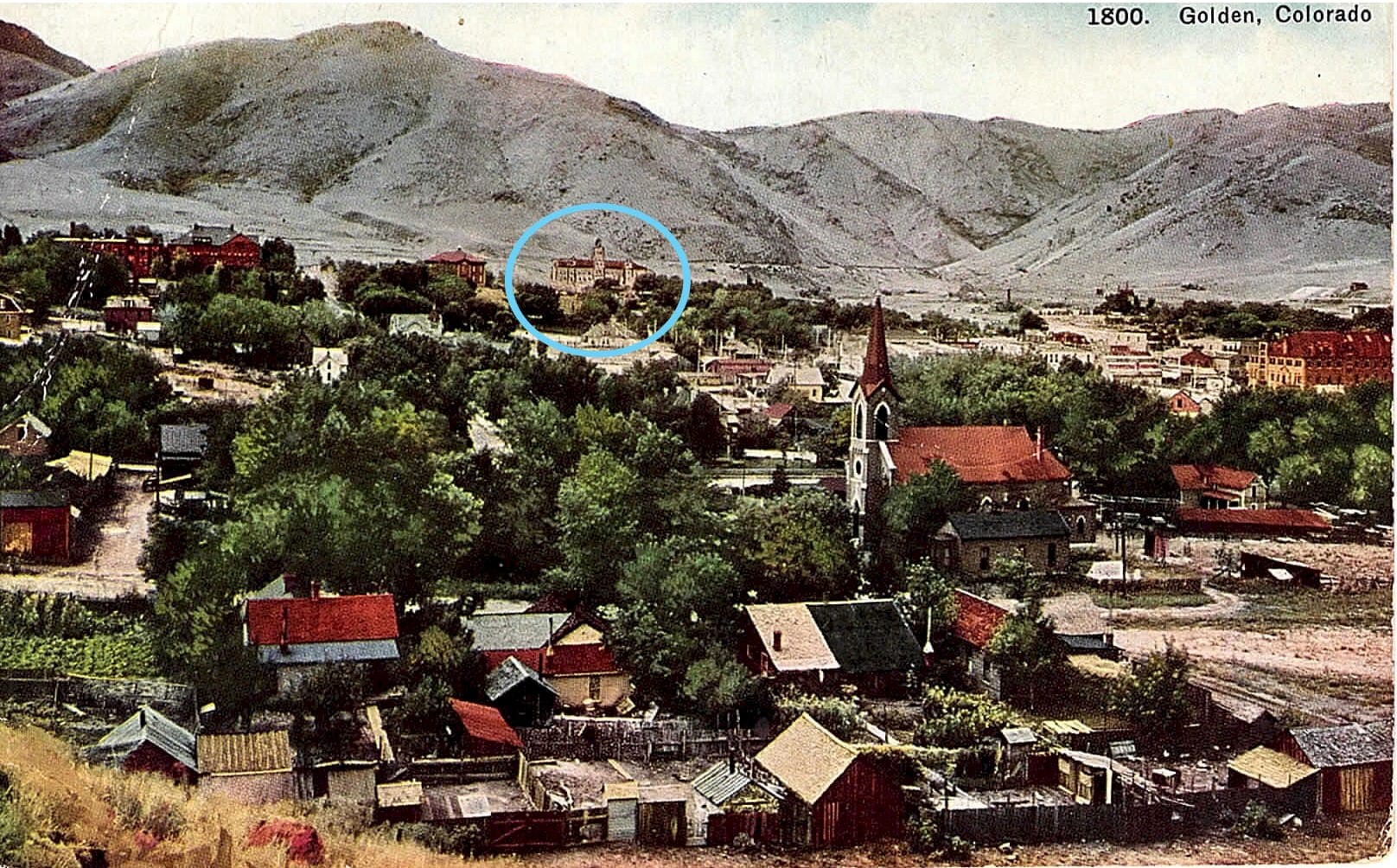 In this interesting photo image of Golden, everything looks true and accurate, but wait. Notice that the School of Mines Guggenheim Hall building has been repositioned about three blocks to the north (visually to the right of the old South School) perhaps to show Golden has even more impressive buildings than would otherwise be shown.