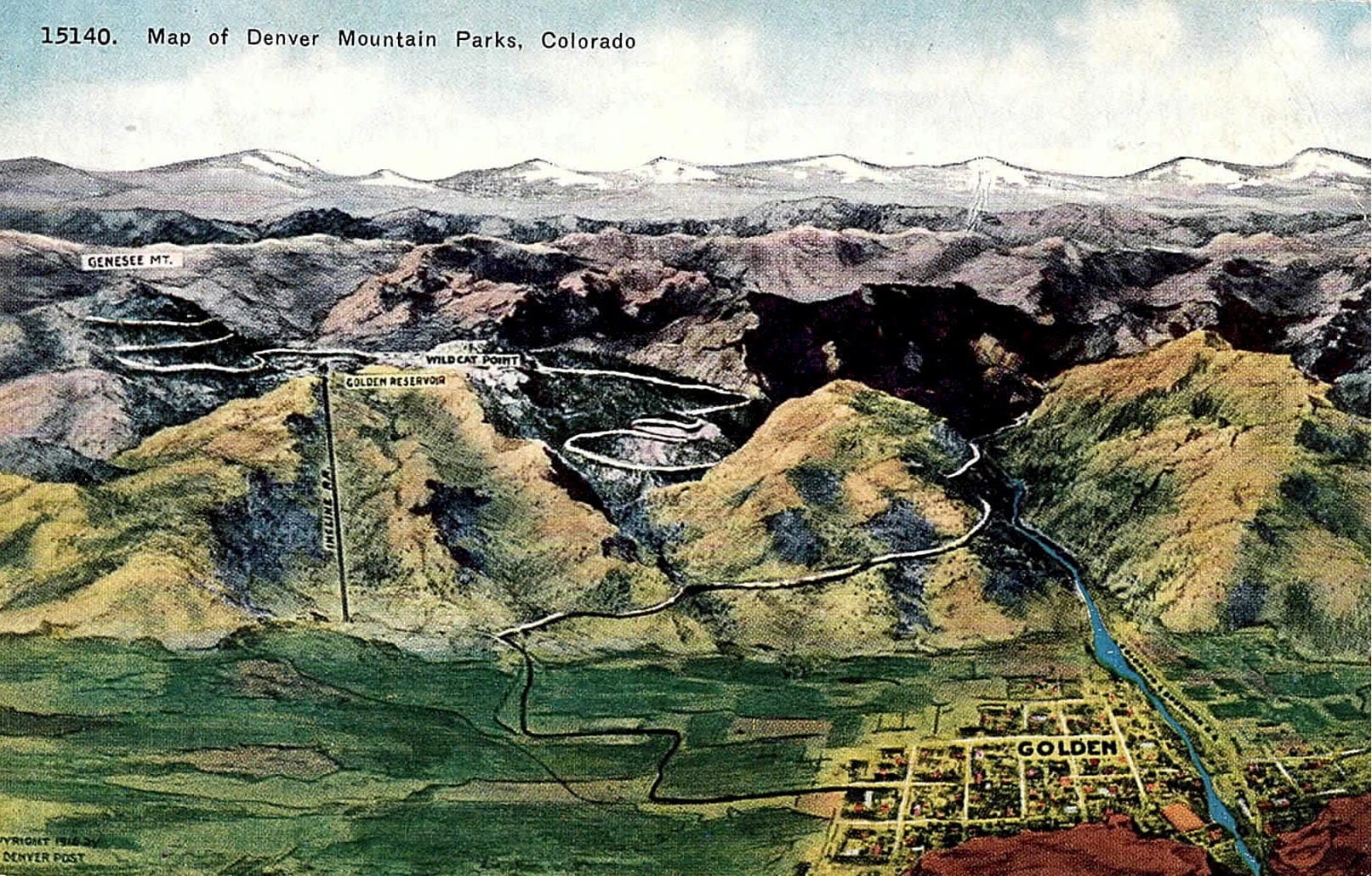 Look closely at this scene of Golden and you will notice that the winding Lookout Mountain road passes behind the front face of Mt. Zion, rather than in-front as constructed. Also, the approach route to the base of the mountain, at least in part, seems imagined. And the alignment of the “Incline RR” (Lookout Mountain Park Funicular) was actually constructed up the ridge to the right of where shown. Were the snow-capped mountains on the distant horizon added?