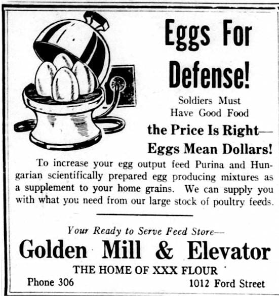 One Golden business had begun incorporating the war into their advertising. The Golden Mill reminded its customers that “Soldiers Must Have Good Food.” Egg output would be better with their Purina chicken chow. “Eggs for Defense!”
