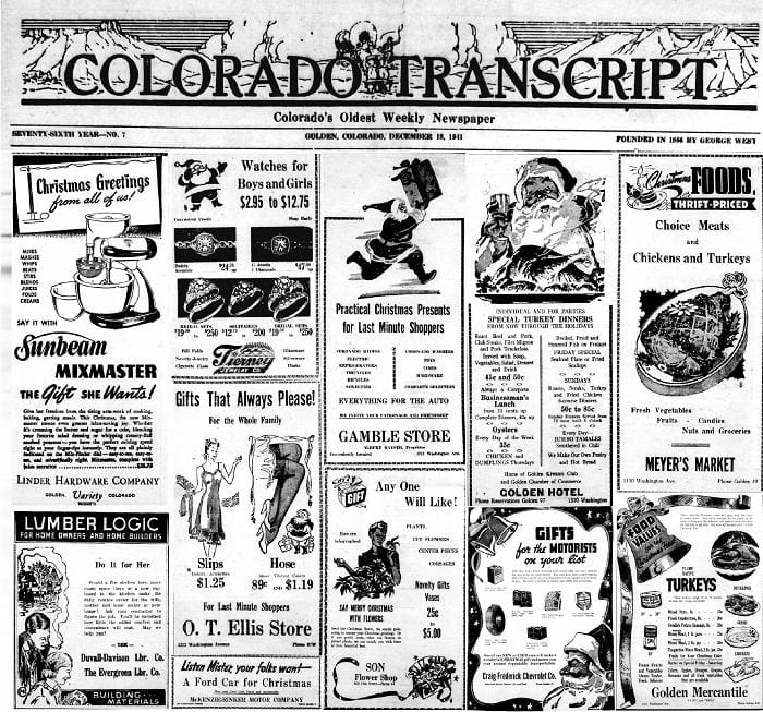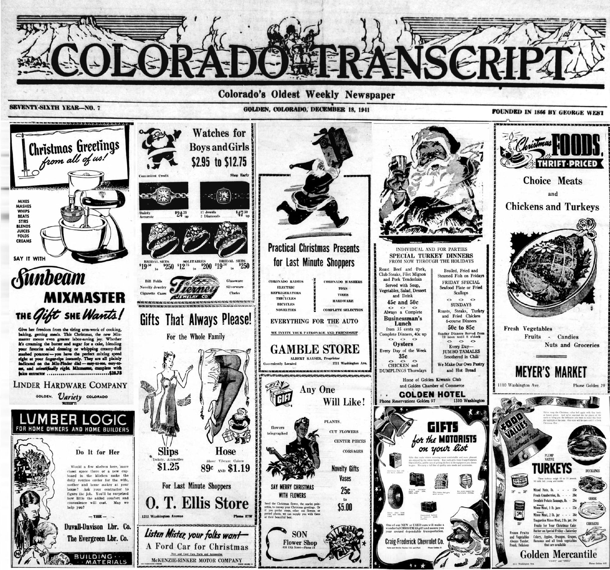 The December 18, 1941 Colorado Transcript showed Golden at a transitional time. After the December 6th bombing of Pearl Harbor, President Roosevelt had declared war on Japan. On the 11th of December, Germany and Italy declared war on the United States, so the U.S., in turn, declared war on them.