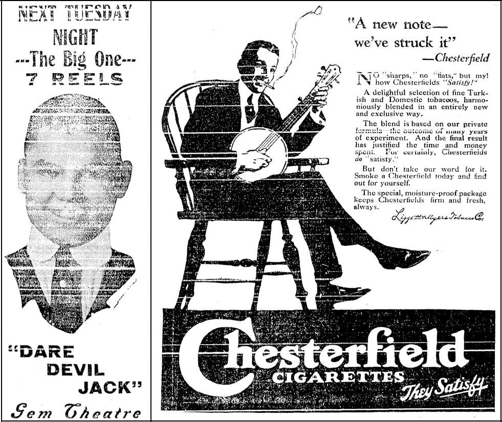 In entertainment news, the Golden Gem theater was advertising a 7-reel film, coming to town the following Tuesday. Early movies were packaged as several reels, each reel weighing about 5 pounds and running for about 11 minutes–so “Dare Devil Jack” ran about 77 minutes. According to IMDB, the film starred Jack Dempsey, the World’s Heavyweight Boxing Champion at that time.