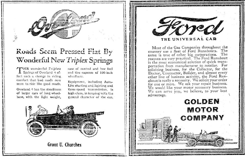 Grant Churches was selling Overland automobiles at his garage on 12th Street, while Golden Motor Company was selling Fords at 11th & Washington.