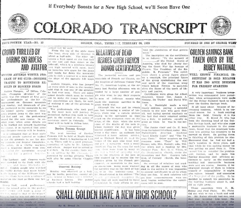 The February 26. 1920 Colorado Transcript reported that three Jefferson County soldiers who died in the World War were being honored by the French government. Skiing was gaining popularity, and an estimated eight thousand people had visited Genesee Mountain to watch an exhibition of skiers on their new run. Traffic jams resulted on the “Williams Highway” (the Lariat Loop).