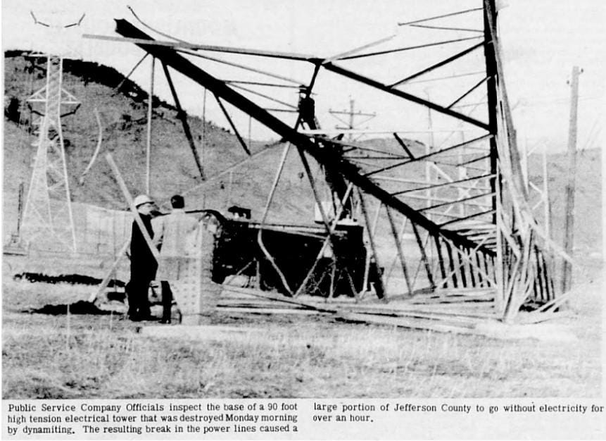 The January 21, 1969 Colorado Transcript reported that one of the high-tension electrical towers at W. 10th Avenue and Johnson Road had been destroyed with explosives. Dynamite was placed at the base of each of the four legs.