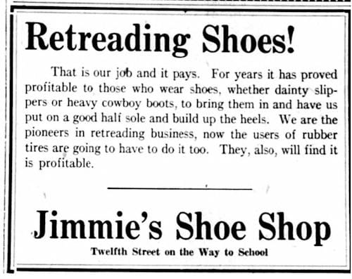 Jimmie’s Shoe Shop adopted the wartime parlance by advertising shoe “retreading.”