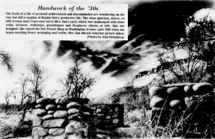 Have you ever wondered about the origins of the stone walls along 44th Street, just east of the railroad track crossing? That property used to belong to Beulah (“Sonny”) Son. She owned a flower shop in Golden from the early 1930s through the mid-50s. She also had greenhouses on her 44th Street property, where she grew some of the flowers she sold in her shop and sold bedding plants.