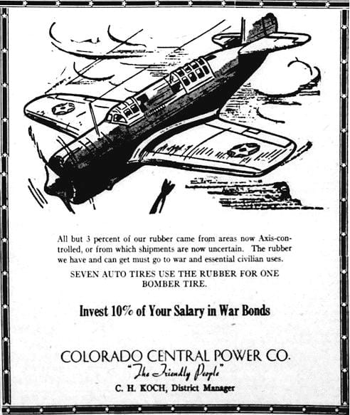The Colorado Central Power advertisement covered both rationing and war bonds, explaining that “all but 3% of our rubber came from areas now Axis-controlled,” and reminding people to save 10% of their salary in war bonds.