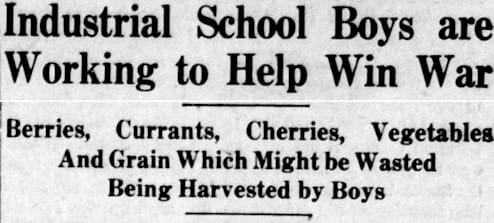 With so many young men serving overseas and so many women working in wartime industries, it was hard to find workers to pick crops. Many of the boys from the Industrial School worked for area farmers harvesting cherries, raspberries, currants, wheat, potatoes, corn, and onions. They were paid for their work. It was considered vocational training, since the school administrators thought it likely that the boys would need gardening, farming, or ranching skills as adults.