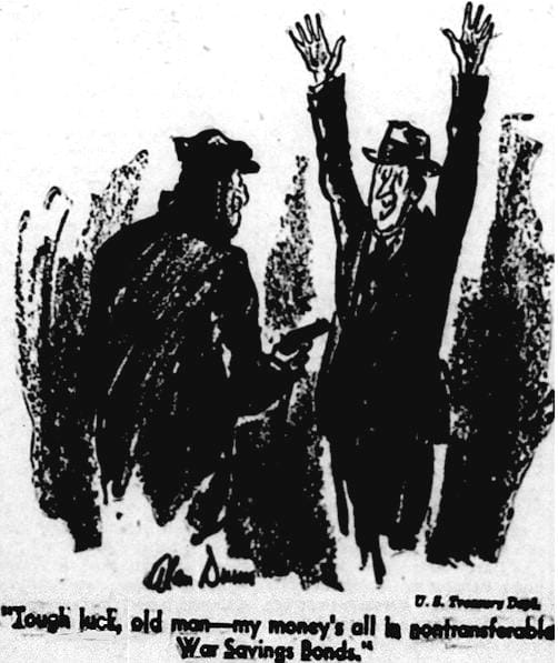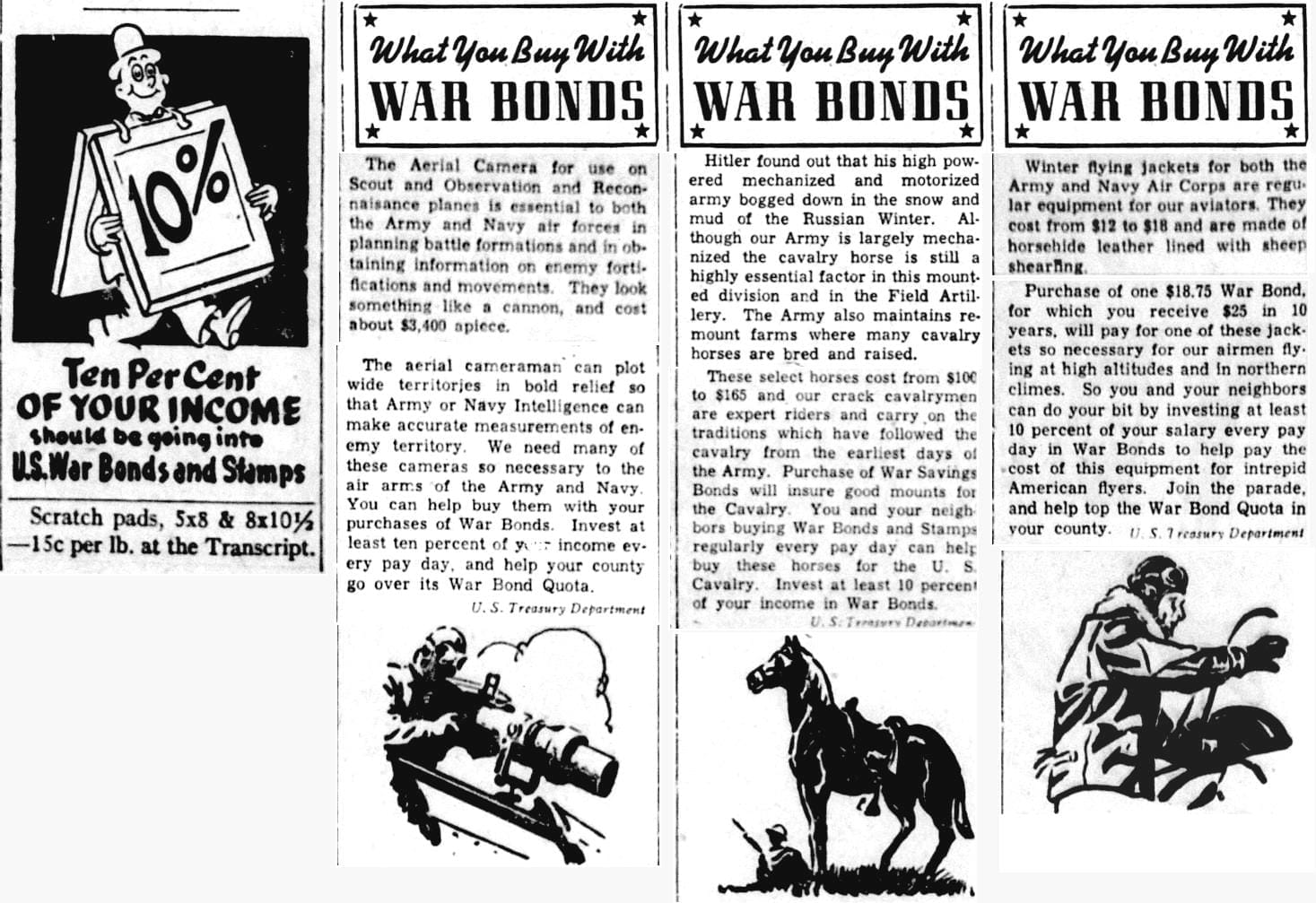War bonds were a recurring theme throughout the paper, with three separate pieces focused on “What You Buy With WAR BONDS,” and a cartoon reminding readers that 10% of their income should go into war bonds.
