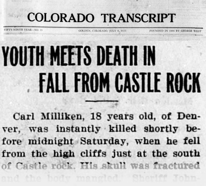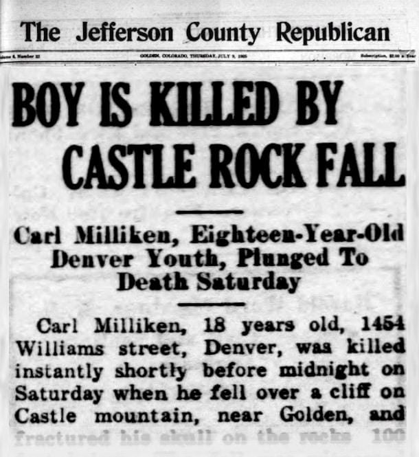 The dance hall on Castle Rock continued to operate, even after the funicular railway shut down. One Saturday night in July of 1925, a carload of boys from Denver arrived, hoping to join the party. They were refused admission, and subsequently two of the boys (brothers Carl and John Milliken) began arguing about whether they should return to Denver. Carl, age 18, marched off, saying he was going to walk to Denver. Instead, he walked off the edge of Castle Rock and fell about 100 feet to the rocks below. His skull was fractured and he died.