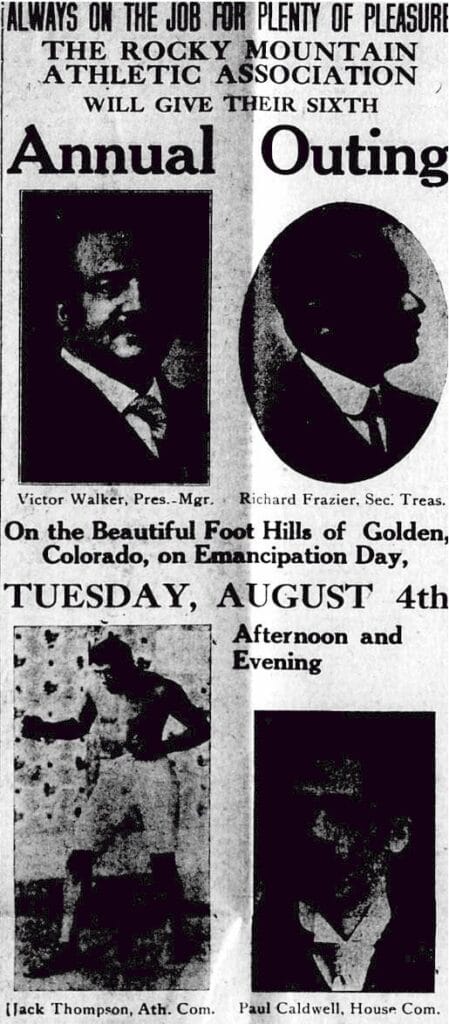 Not even the threatening weather, nor the rain itself dampened the ardor and the blazing enthusiasm so copiously furnished upon the sixth annual outing and the celebration of the Emancipation day, August 4th, held at Golden by the Rocky Mountain Athletic club. The crowd on the Inter-Mountain cars sang songs, gave yells, and witty jokes were in abundance…. The best of order was maintained, not a cross word spoken.