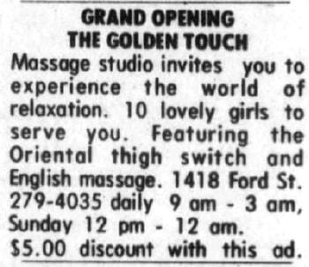 In June of 1976, Golden was concerned about a new massage parlor that had opened at 1418 Ford Street (map). Within days after its opening, Mayor Crawford said he had received 60-70 complaints about the business. A week later, he reported that he had received “far more.”