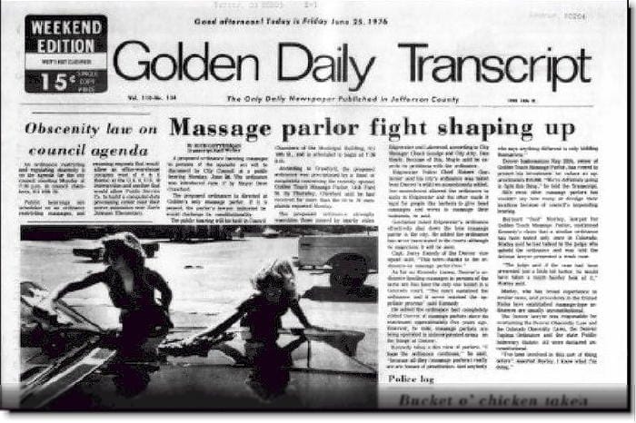 Denver had fought the existence of massage parlors by passing an ordinance stating that massages were illegal when provided by persons of the opposite sex. The Captain of the Denver Vice Squad said that “all they (massage parlors) really are are houses of prostitution.” Lakewood soon enacted a similar ordinance. Edgewater followed suit but added amendments making it “legal for people like barbers to give head massages and wives to massage their husbands.”