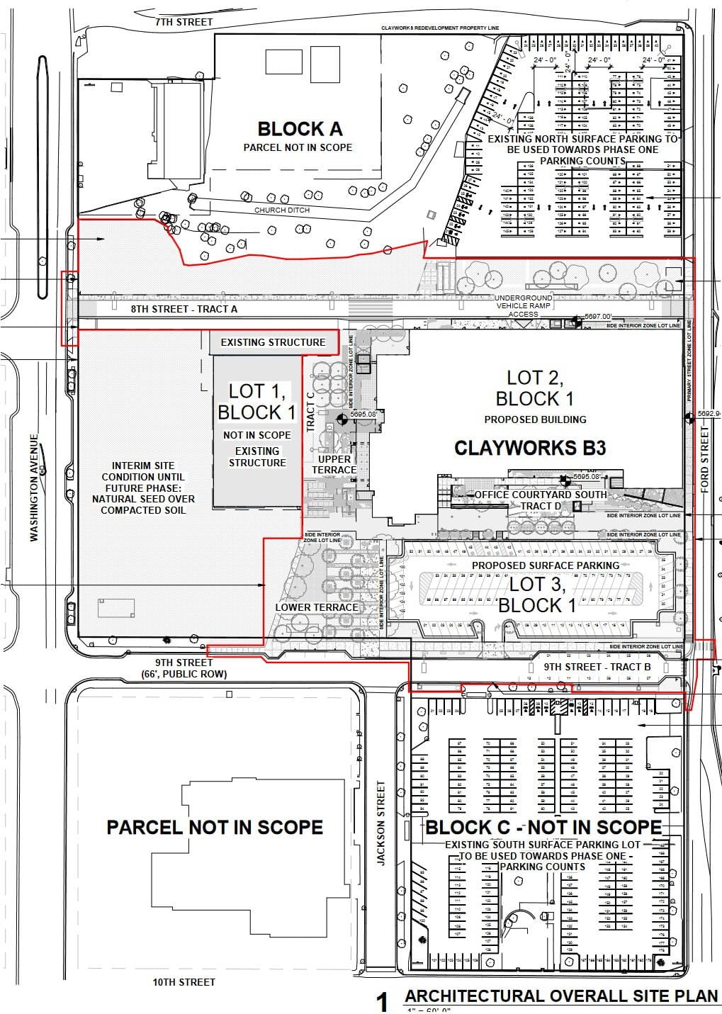 The Planning Commission will review the plans for the first building in the CoorsTek redevelopment/Clayworks-to-Be. It will be a 4-story office building in the center-east section of the property (labeled as "Clayworks B3" on the drawing above).