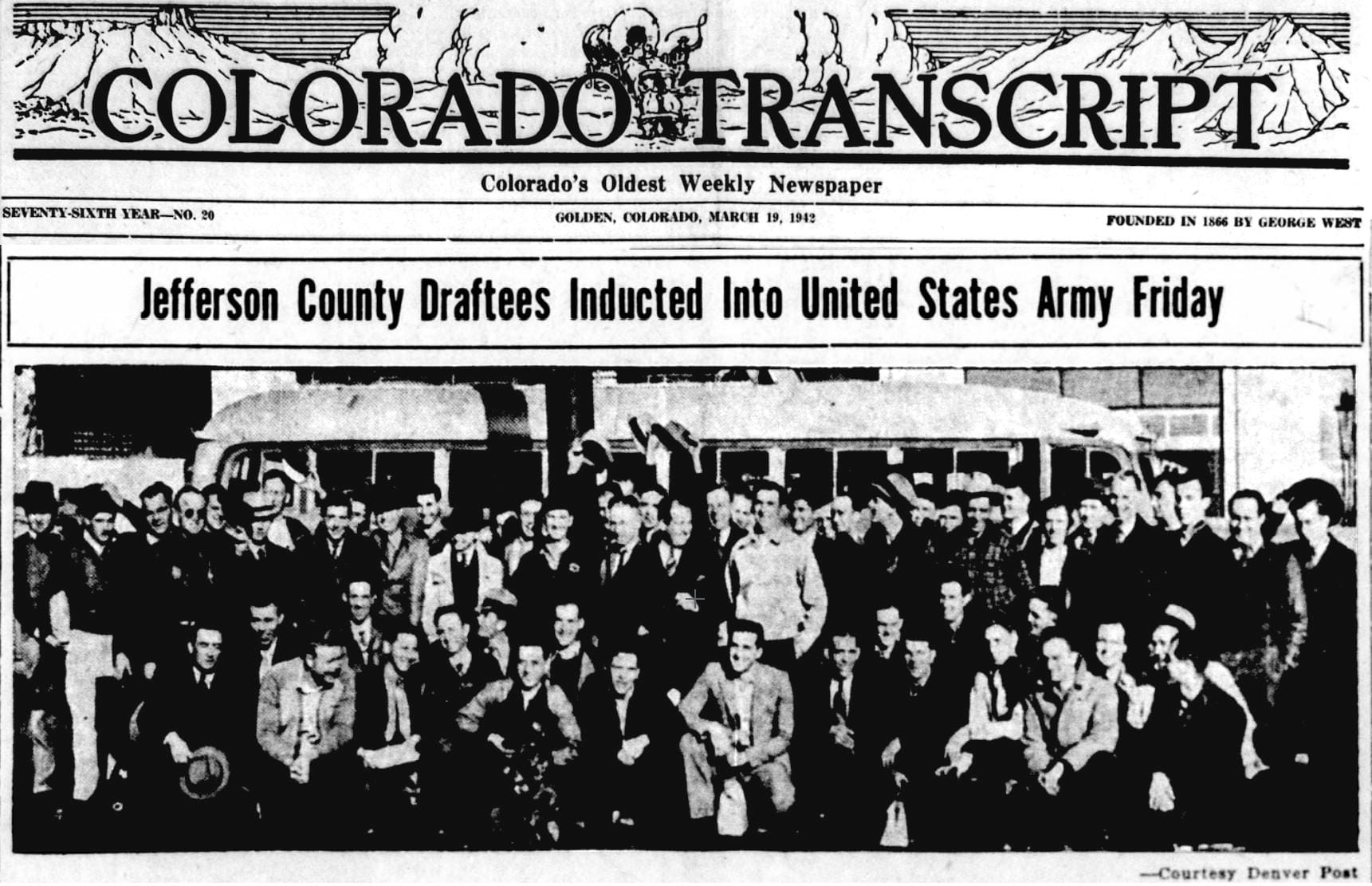 In March of 1942, we were four months into World War II and the country was rapidly mobilizing. The March 19, 1942 Colorado Transcript announced that 2,218 Jefferson County men had been required to register with the draft board. The 65 men shown above had been inducted into the U.S. Army and had left for Fort Logan the previous Friday. Six Golden boys were included in that group.