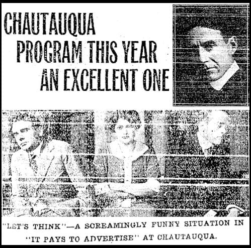 The bad taste must have lingered, because in 1925 the paper commented, “This is the time of year when guarantors of Chautauquas hold meetings and decide how much they will have to dig up to make up deficits. Chautauqua managements always work on a sure-thing basis, and a few public spirited citizens are always the sure things. However, it seems that every town and city falls for the plan at least once in a lifetime.”