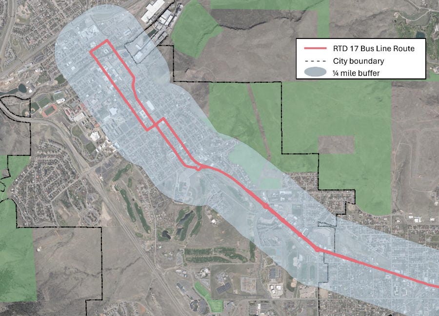 There is a new state law mandating that multifamily housing within 1/4 mile of a transit route will have no parking requirements. Because this already applies to the area along the RTD bus line, staff is suggesting that area (see the map above) as the target of the TDM strategy.