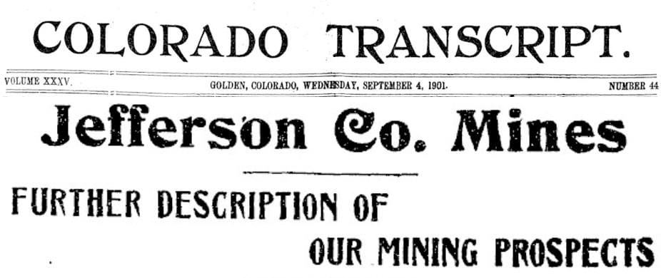 The September 4, 1901 Colorado Transcript included an article reviewing various mining prospects in Jefferson County. Although the county never produced much in the way of metal, the Transcript never stopped hoping that this would be the site of the next gold rush (or silver rush, or any other profitable metal).