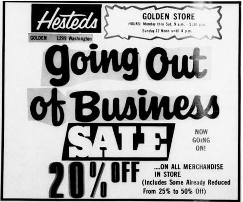 The December 20, 1976 Golden Transcript included this ad, announcing that Hesteds Department Store was going out of business.