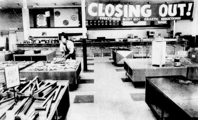 By late January, the remaining fixtures were sold in an auction, with display tables going for $8, glass display cases for $15, clothing racks for $6, and benches for $5.