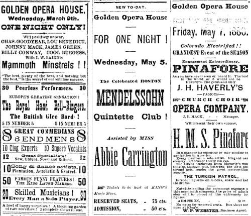 Many troupes of entertainers traveled the country and scheduled stopovers in opera houses as they went. Over the years, the Golden Opera House hosted plays, comedians, orchestras, singers, vaudeville shows, dances, church services, political meetings, dance classes, and graduations (both Golden High School and the School of Mines). Minstrel shows were very popular, and we hosted many, many productions of Uncle Tom’s Cabin. The Golden Opera House hosted Blind Boone, Henrietta Vinton Davis, and William Jennings Bryan.