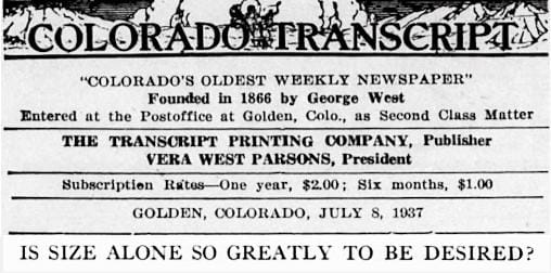 Thanks to the Golden History Museum for providing the online cache of historic Transcripts, and to the Golden Transcript for documenting our history since 1866!