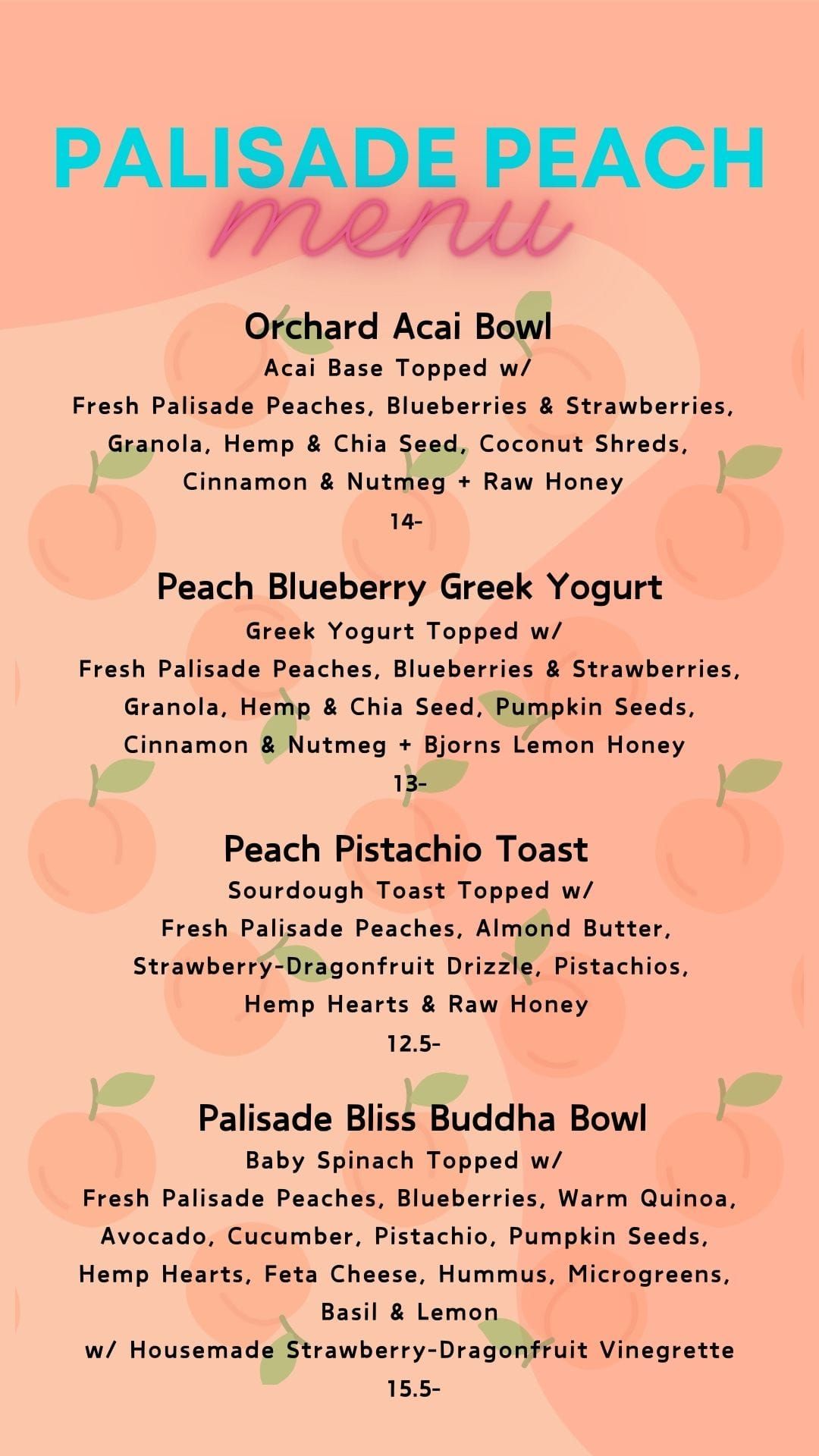 Kona Bowls is offering a special peach menu through September (or until the peaches run out!). Enjoy an Orchard Acai Bowl, Peach Blueberry Greek Yogurt, Peach Pistachio Toast, or a Palisade Bliss Buddha Bowl.