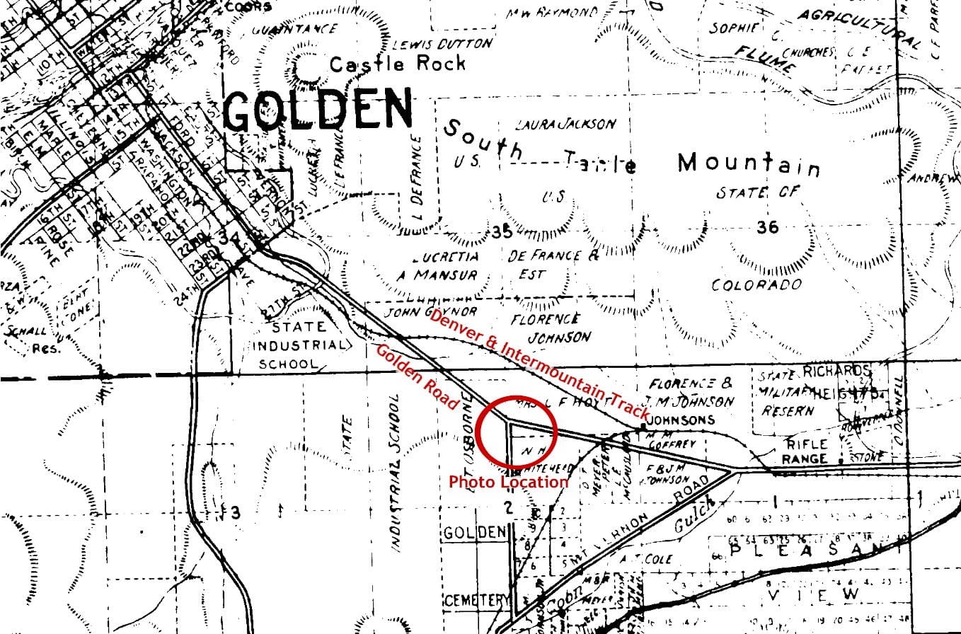 Based on the map above, which is approximately the same vintage, I think that’s the intersection of what we’d now call “South Golden Road” and “Ulysses Street.” The railroad tracks that appear a bit higher on the mountain are the Denver & Intermountain, on its way to Pleasant View and Lakewood.