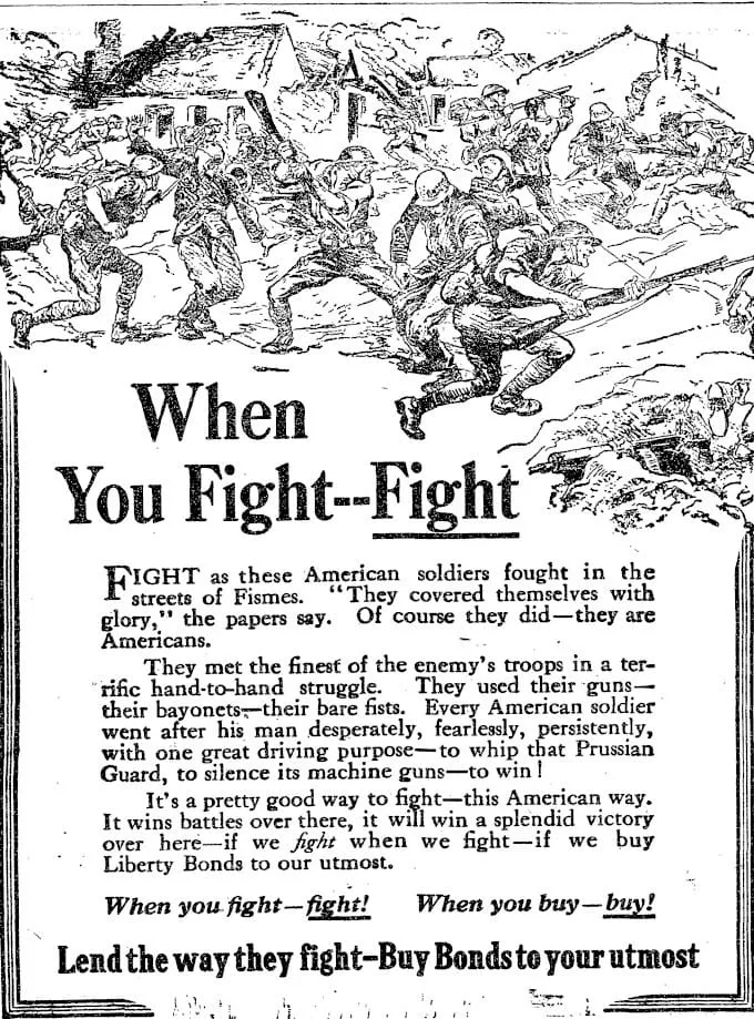 The local businesses all joined in: most of their advertisements included plugs to buy war bonds. The Transcript editors sprinkled the paper with small ads describing what the bond money could buy (trench mortar shells, fragmentation drop bombs, hand grenades, shells, rifles, incendiary bombs, etc.).