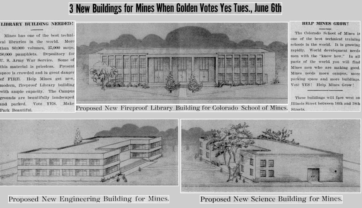 70 Years Ago – The Citizens of Golden were being asked to given up their City Park so the County could build a new courthouse and the School of Mines could add several new buildings to their campus. The Colorado Transcript published the drawings above to encourage citizens to vote Yes on their June 6th ballots. They did. You can learn more about our long-lost City Park here.