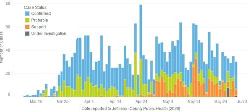Jefferson County’s case count page says that as of 3PM yesterday, there have been 2,558cases in Jefferson County (up from 2,506). There have been 170 deaths (up from 167) and 366 are hospitalized (up from 361). There are 212 known cases in Golden (up from 206).