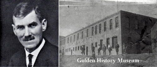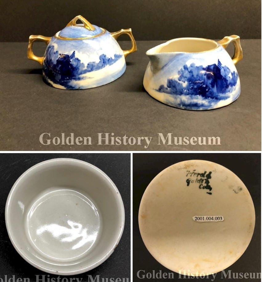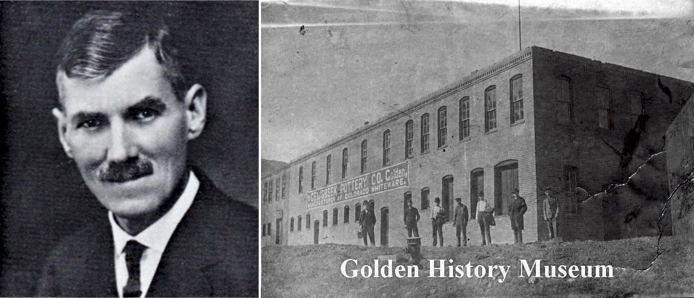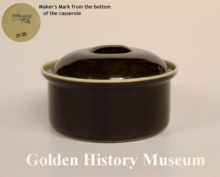 John Herold, like Adolph Coors, was a German emigrant who had been trained in the fine ceramic business in Germany, and spent some years in Ohio working as the art superintendent for Roseville Pottery, in Zanesville, Ohio. He moved to Colorado in 1903 because of health reasons. He determined that local clay deposits held promise for use in high temperature cookware and began experimenting with local clays in the defunct pottery works of the Geijsbeek Pottery Co., which went bankrupt in 1902. Herold’s Golden Pottery was located north of the railroad tracks on now 8th Street near the entrance to Clear Creek Canyon. He worked as a one-man operation.