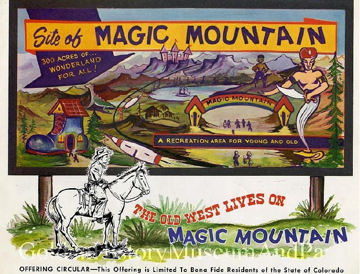 In 1957, a group of developers announced plans to build a Disneyland-inspired amusement park south of Golden. The park was to be called “Magic Mountain.” The development was at some distance from downtown Golden, but other property owners–including the Colorado Central Power Company (now Xcel) and the new Presbyterian and Seventh Day Adventist churches had also requested annexation south of town.