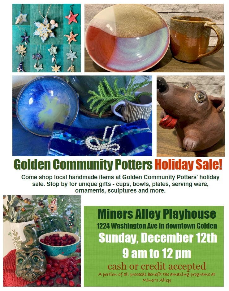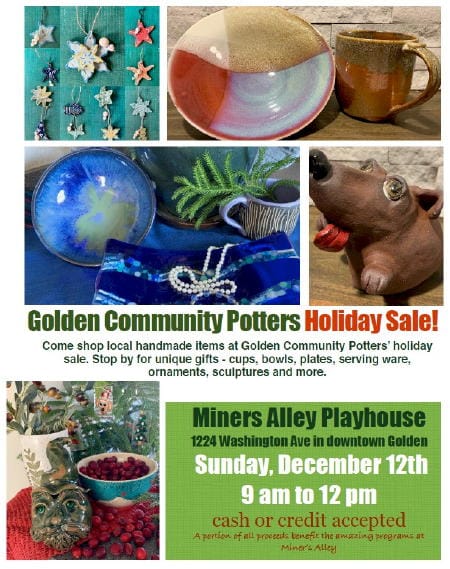 Come shop local handmade items at the Golden Community Potters’ Holiday Sale. Stop by for unique gifts — cups, bowls, plates, serving ware, ornaments, sculptures, and more. Cash or credit accepted. A portion of all proceeds benefit the amazing programs at Miners Alley Playhouse.