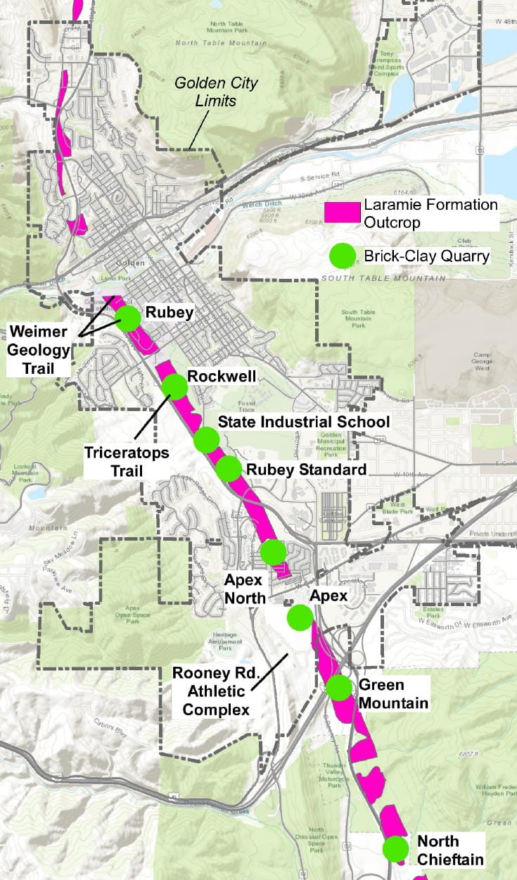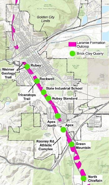 Why so much brick-clay in and around Golden? Like Golden’s black diamonds (coal), brick-clay occurs in the Laramie Formation, a rock unit that trends north-south across the west side of Golden. The Laramie also contains amazing dinosaur tracks and palm-tree imprints visible today along the Weimer Geology Trail at Colorado School of Mines and Triceratops Trail west of Fossil Trace Golf Course. These features occur together because of how Laramie sediments were deposited: across an extensive delta plain, somewhat like that of today’s Mississippi River around New Orleans. Swamps with decaying vegetation like palm trees eventually formed coal, and shallow lakes with less vegetation became filled with clay during flood times. Dinosaurs and primitive mammals walked around on the soft, clayey ground among the lakes and swamps, leaving behind footprints.