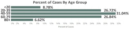 Jefferson County’s case count page says that as of 3:30PM yesterday, there were 786 (up from 753) cases in Jefferson County. There have been 29 deaths (up from 27) and 193 are hospitalized (up from 185). There are 70 known cases in Golden (up from 67). Here is the breakdown of cases by age group: