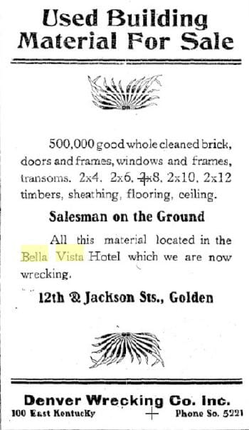 On this date in 2020, a crew began dismantling the Bella Vista Hotel on 12th Street (see location on Google maps). Constructed in the early 1880s, the Bella Vista was originally called the “Hotel St. Bernard,” and later renamed the “Bella Vista Hotel.” The building had stores, the post office, a bar, and a billiard room on the first floor, a grand ballroom on the second floor, and 75 guestrooms above. Unfortunately, in that era Golden just couldn’t support a hotel of that size. It was never a commercial success.